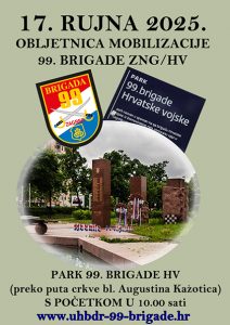 poštovani članovi obitelji pripadnika brigade te stanovnici naše voljene Peščenice pozivamo Vas da nam se dana 17. rujna 2025. godine pridružite u svečanoj proslavi obilježavanja Dana mobilizacije 99. brigade ZNG/HV koja će se održati u Parku 99. brigade Hrvatske vojske, preko puta crkve bl. Augustina Kažotića, na Ivanićgradskoj ulici, s početkom u 10.00 sati. Svečani program započinje polaganjem vijenaca i svijeća kod spomenika palim pripadnicima 99. brigade te ostalim poginulim braniteljima s gradske četvrti Peščenica-Žitnjak.